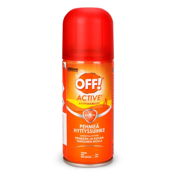 OFF! Active Pehmeä hyttyssuihke on uudenlainen kuivasuihke, joka on miellyttävä käyttää. Suihke on niin hienojakoista, että se kuivuu iholle suihkuttaessa välittömästi. Tutustu huolella pakkauksen käyttöohjeisiin ja varoituksiin ennen käyttöä